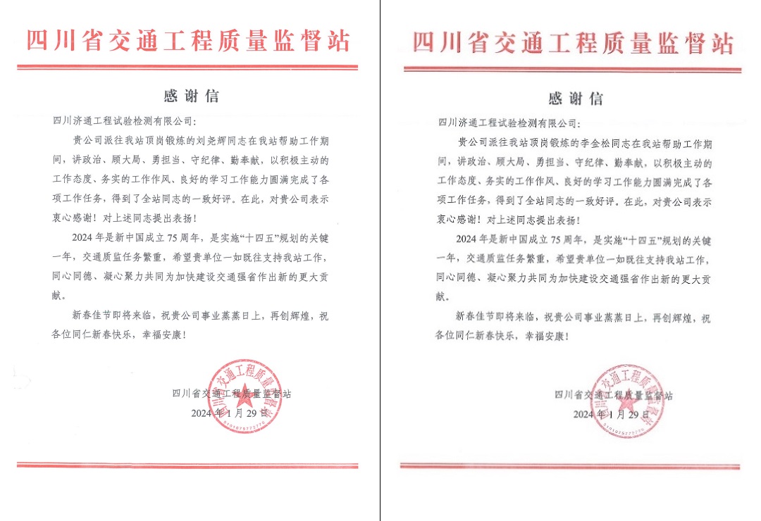近日,公司收到兩封來自四川省交通工程質量監(jiān)督站感謝信,信中對我公司劉堯輝、李金松兩位借調人員的工作表現(xiàn)給予充分的肯定...